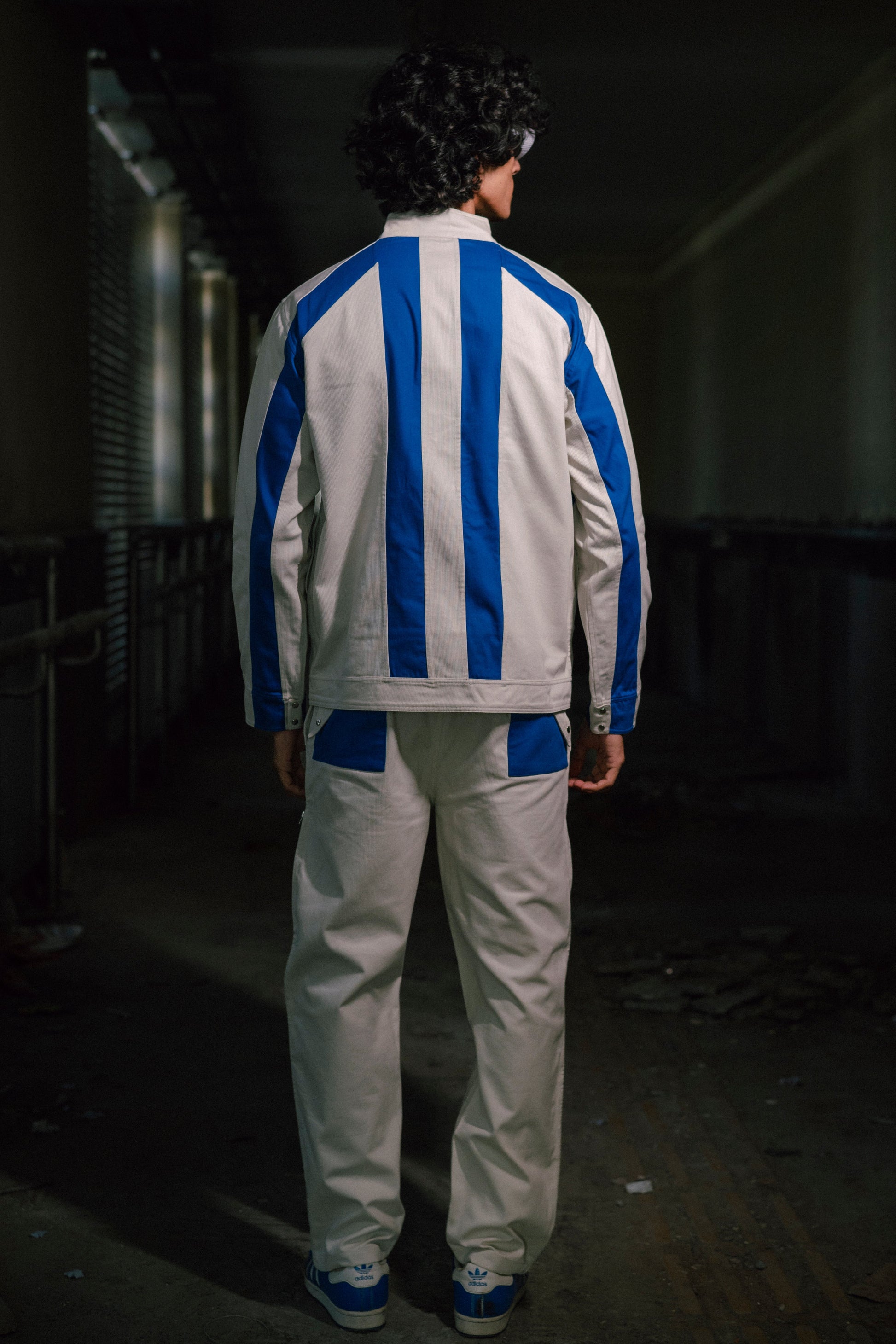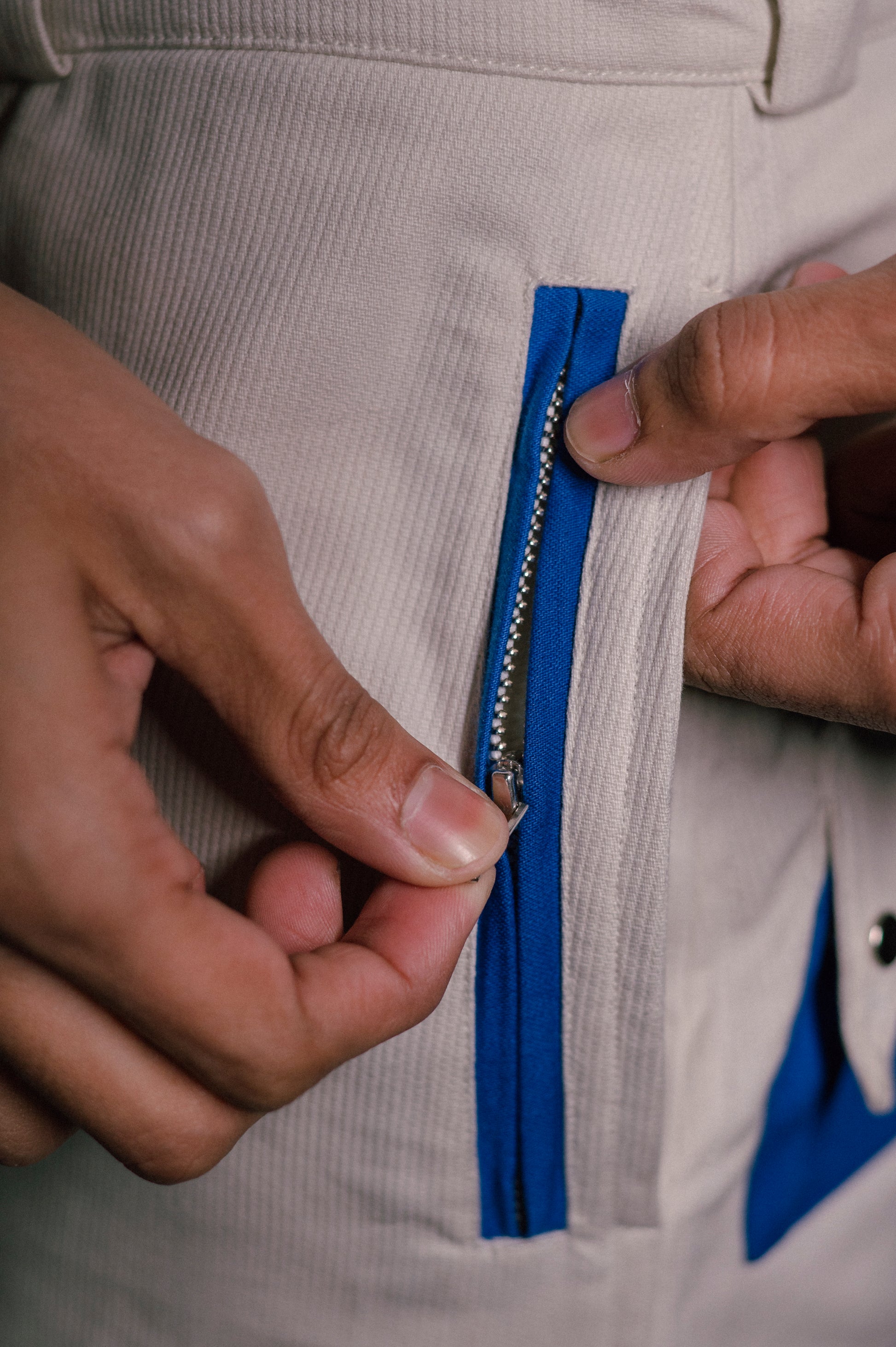 Tailored utility meets statement design. Made from 100% deadstock woven twill with cobalt colour-block panels, these trousers balance function and form. Eight pockets keep storage practical, while side zip panels let you switch from a streamlined cut to a wider leg that reveals the contrast detailing.